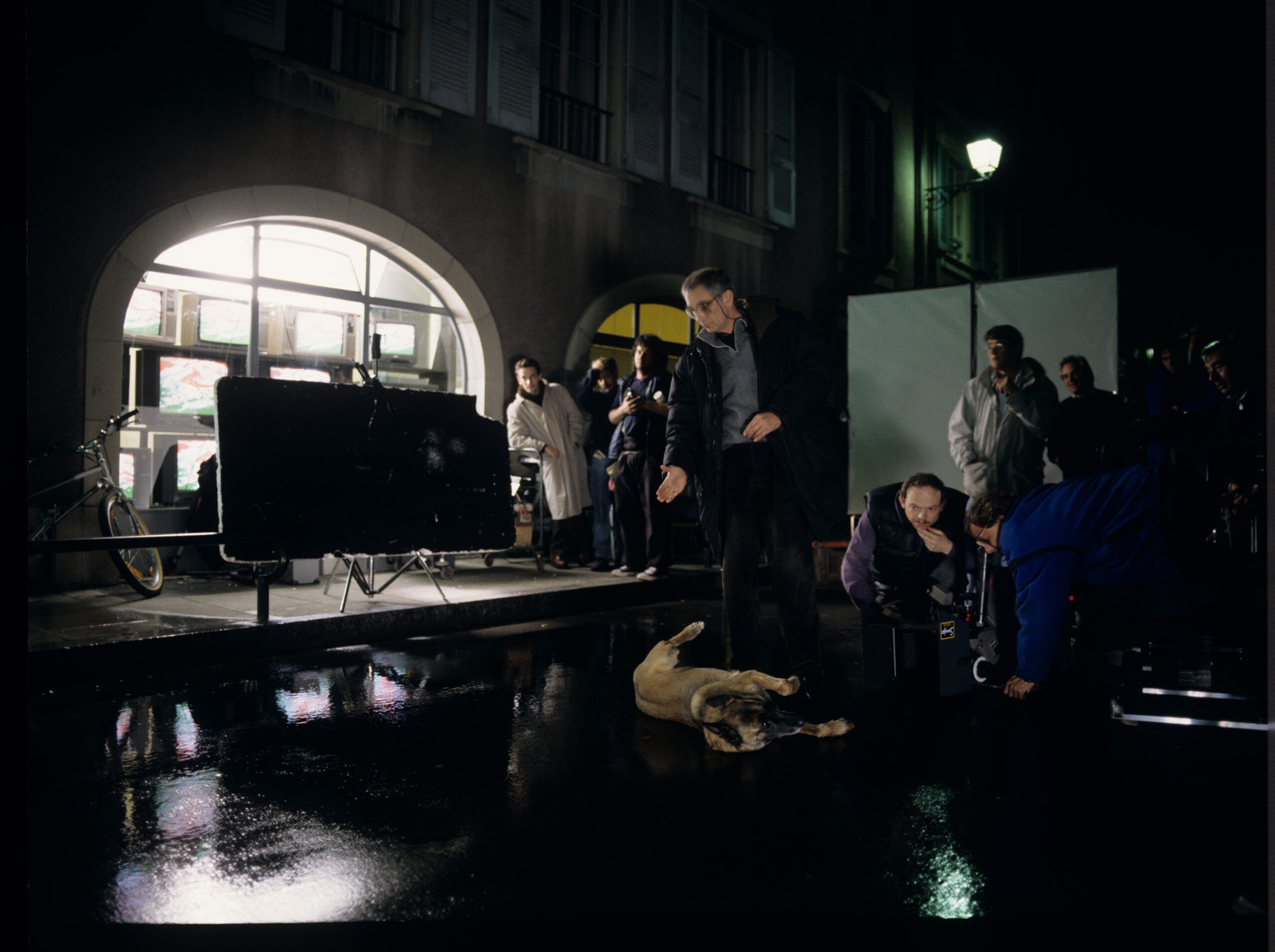 The crew is on set on a rain-drenched street. Krzysztof Kieślowski (director), Piotr Sobociński (cinematographer), Henryk Jedynak (cameraman’s cooperation), Michael Charvaz (prop designer) prepare the dog Rita for filming the shot of the dog being hit by Valentine’s car.