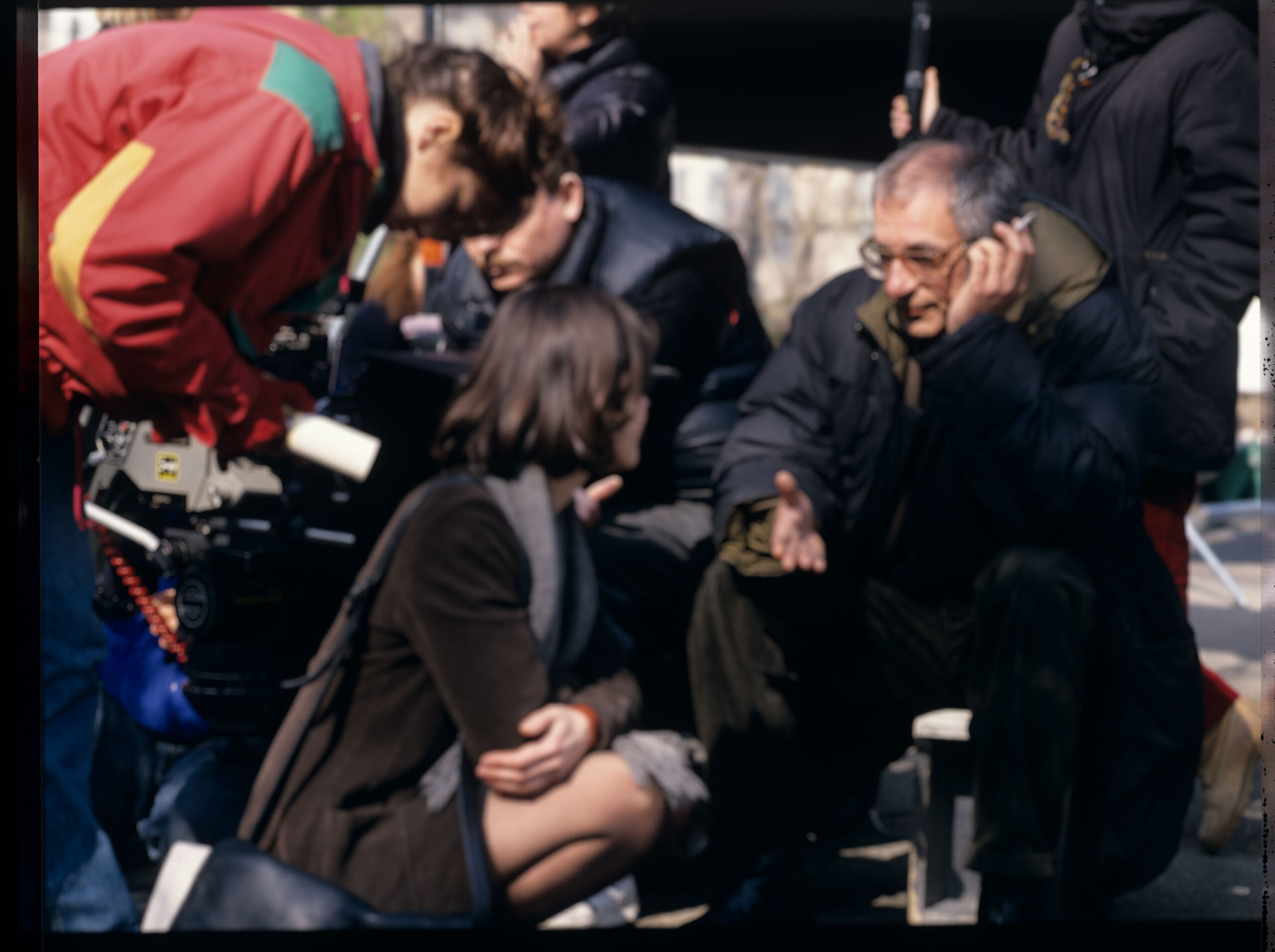Krzysztof Kieślowski (director) and actress Irene Jacob on the shooting set.