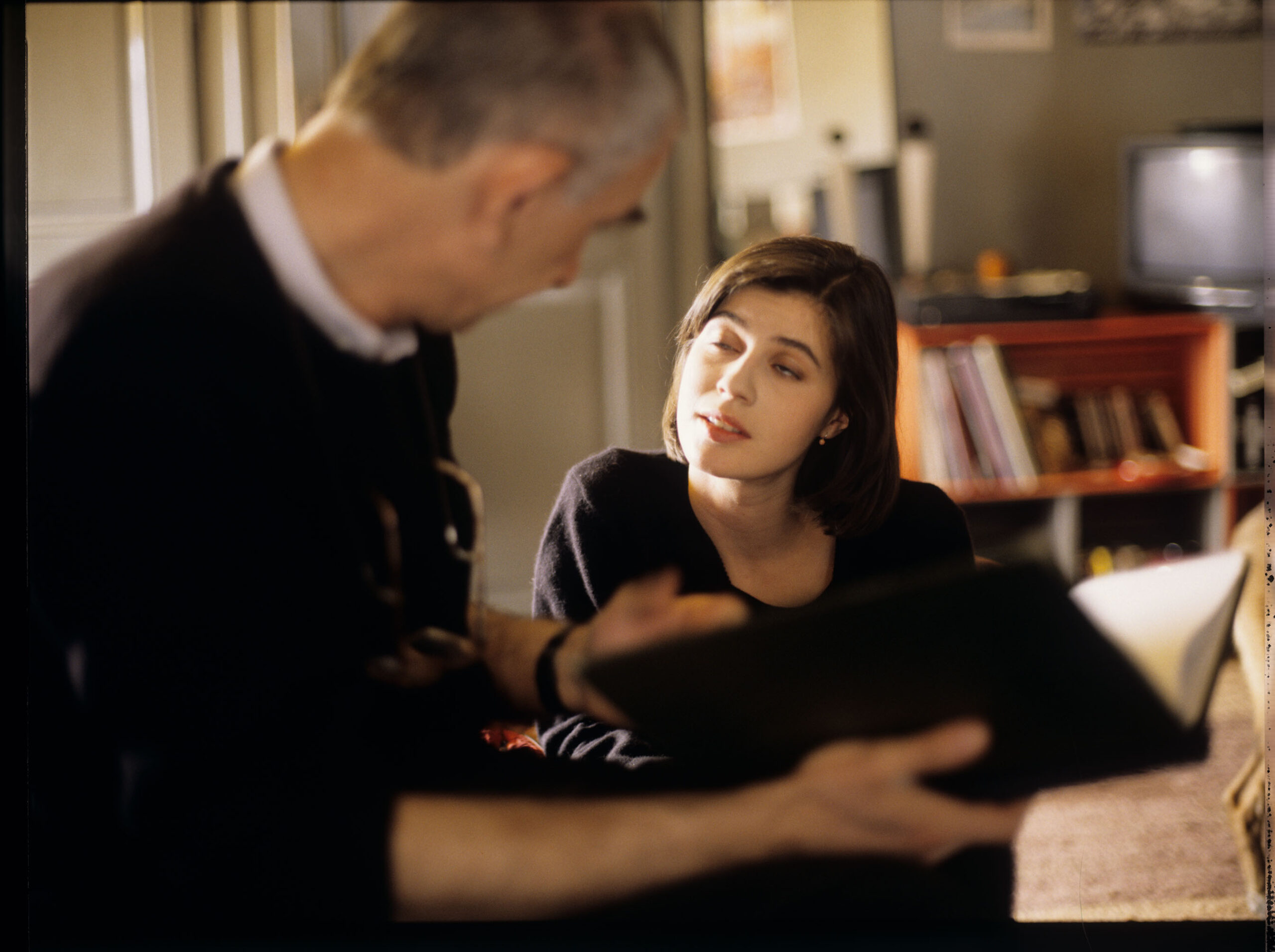Krzysztof Kieślowski (director) gives instructions to Irene Jacob (player of the main role) on the set in the judge’s apartment.