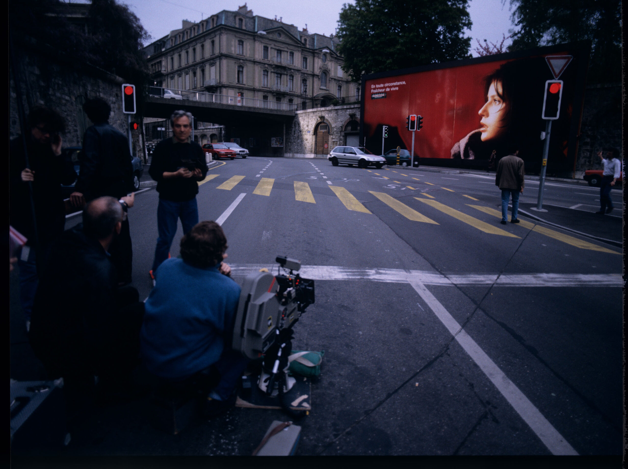 The crew on the set on a Geneva street, where a huge advertising billboard with the image of Valentine – the main character of the film – was hung. The photo shows: Krzysztof Kieślowski (director), Piotr Sobociński (cinematographer), Brigitte Taillandier (sound operator) and technicians.