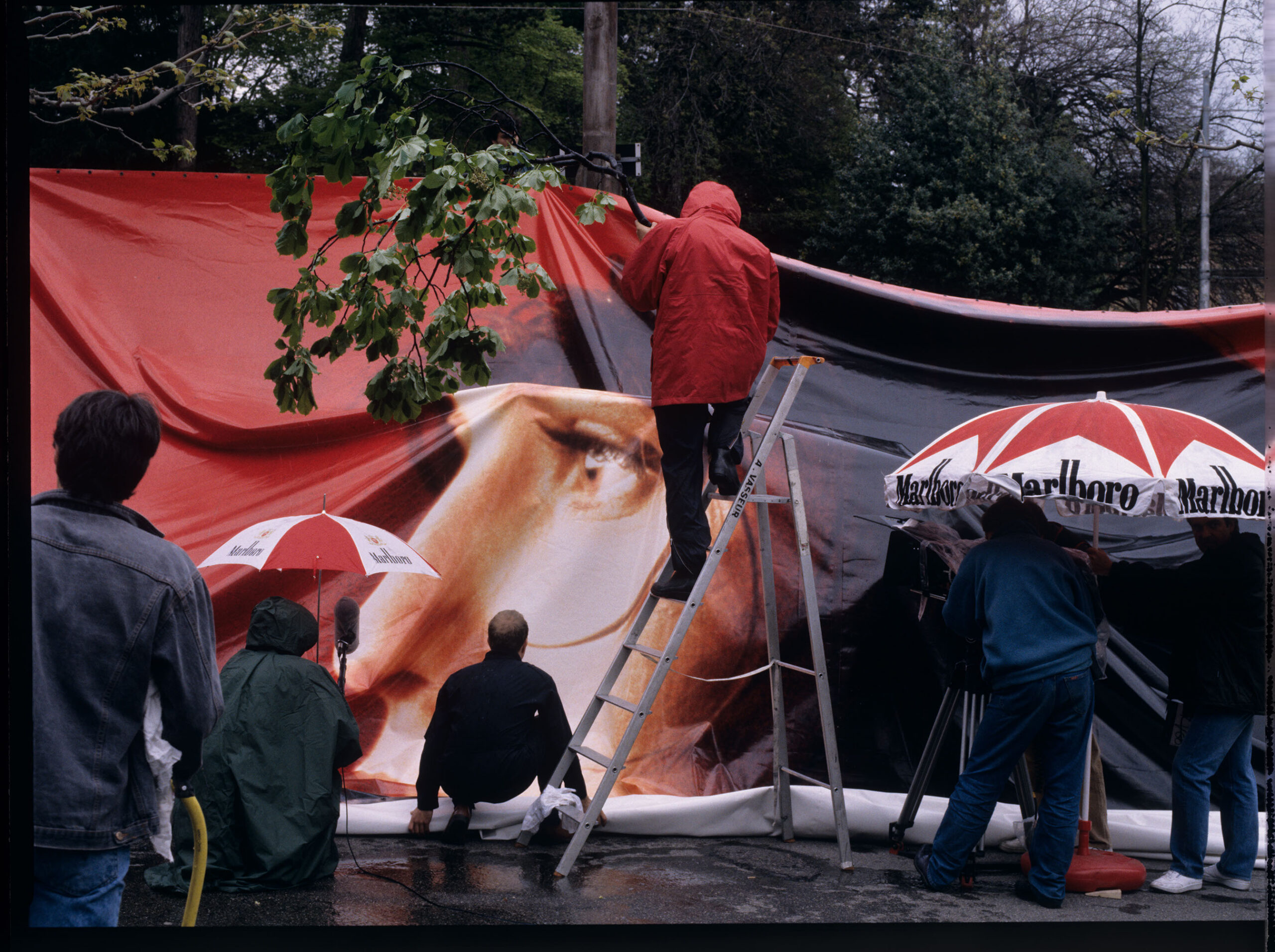 Shooting the scene of dismantling an advertising billboard during a storm over Geneva.