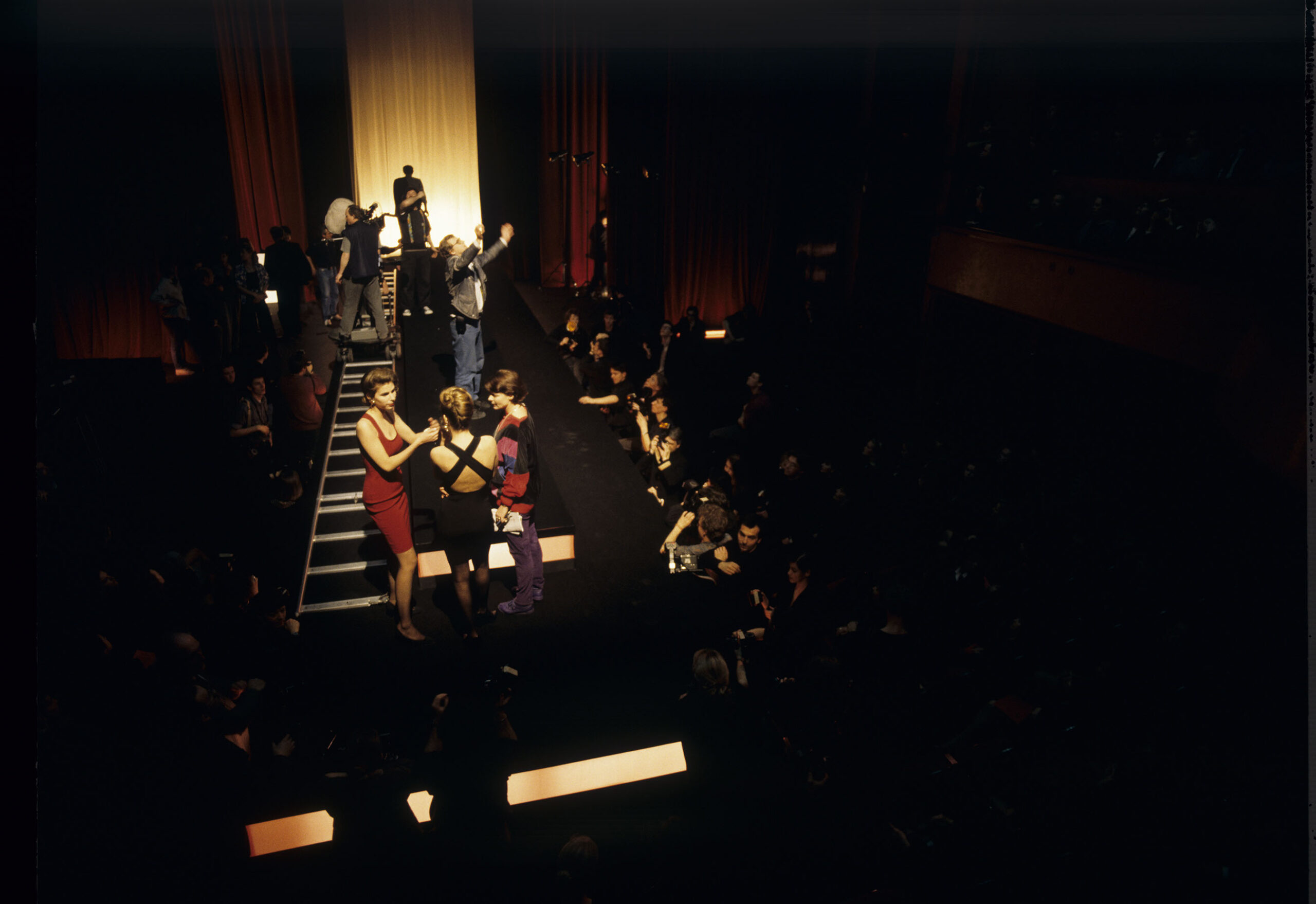 Shooting a fashion show scene in a theater with Valentine. On the set: actress Irene Jacob as Valentine, cameraman Piotr Sobociński, director Krzysztof Kieślowski, other crew members and extras.
