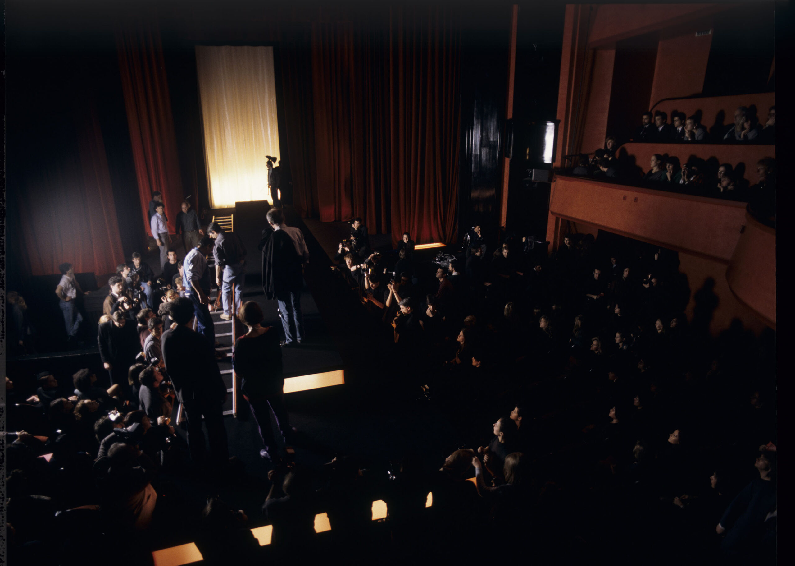 Shooting a fashion show scene in a theater with Valentine. On the set: actress Irene Jacob as Valentine, cameraman Piotr Sobociński, director Krzysztof Kieślowski, other crew members and extras.